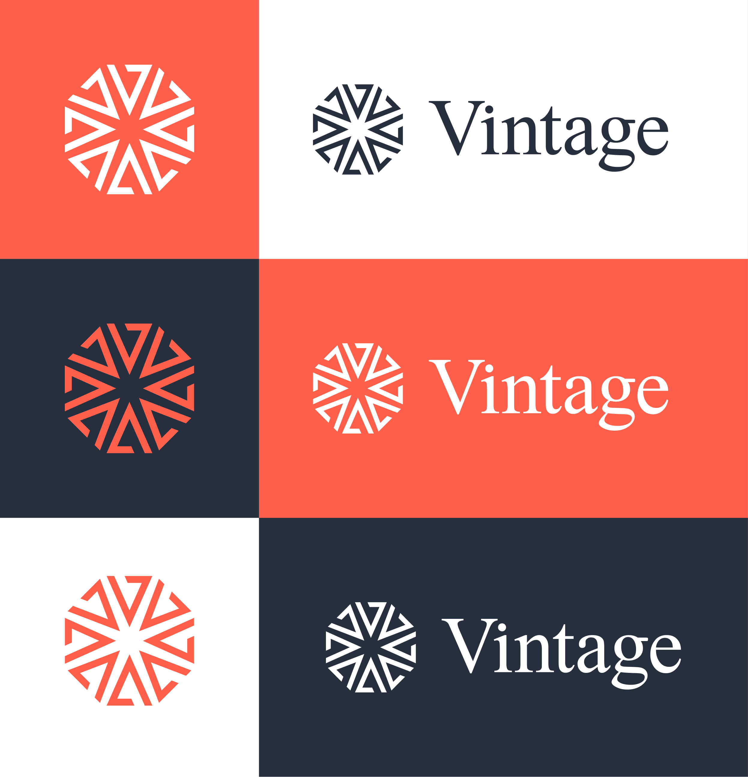 The Vintage Funds identity consists of a primary wordmark lockup and a geometric emblem, designed to reflect sophistication, structure, and discipline. Together, they create a modern-yet-timeless identity that scales across digital, print, and physical applications.